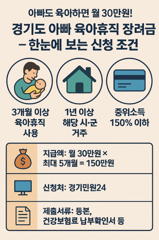 경기도 아빠 육아휴직 장려금 신청방법 총정리. 월 30만원씩 최대 150만원 지급! 신청조건, 서류, 지역까지 안내합니다.