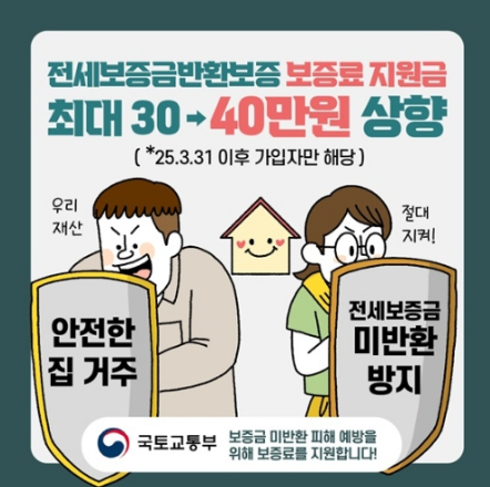 국토부가 전세보증금반환보증 보증료 지원금을 최대 40만원까지 상향했습니다. 신청 조건, 방법, 대상자와 제외 대상까지 한눈에 정리해드립니다.